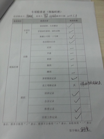 1、以上2014年第2季度第2次(5月)抽查结果,本次检查结果及考核情况将计入各区域、现场管理人员绩效考核体系。 2.2014年第2季度第3次(6月)检查方式为抽查、夜查及暗访。 |
